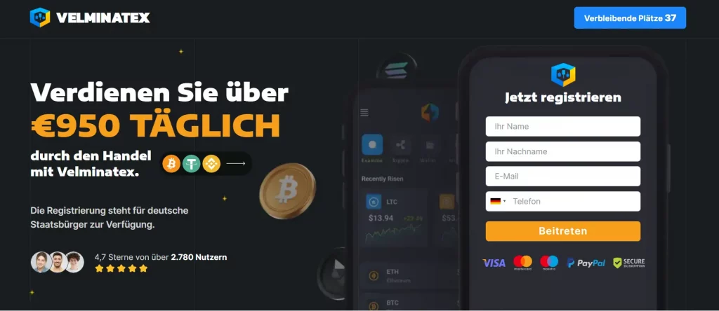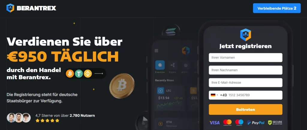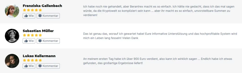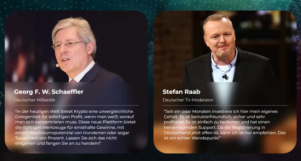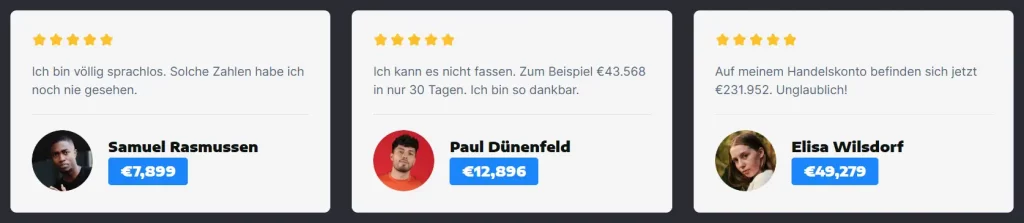„Seit einigen Monaten investiere ich hier mein eigenes Einkommen. Die Plattform ist benutzerfreundlich, sicher und äußerst gewinnbringend. Sie lässt sich leicht bedienen und bietet exzellenten Support. Jetzt, da die Registrierung in Deutschland möglich ist, kann ich sie nur weiterempfehlen. Diese Plattform verändert alles.“
