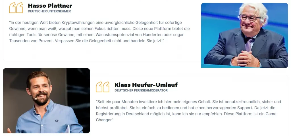 Die Seite sieht vielversprechend aus. 950 € täglich ist ein ansehnliches Zusatzeinkommen. Wer möchte das nicht? SAP-Mitbegründer und Milliardär Hasso Plattner sowie TV-Entertainer Klaas empfehlen die Plattform. Mehrere Nutzer stehen mit ihrem Portrait und Namen zur Seite und haben Top-Bewertungen abgegeben.