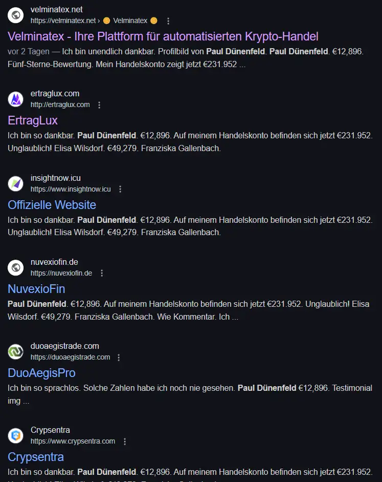 Aus Interesse habe ich den Fantasie-Kunden „Paul Dünenfeld“ gegoogelt und siehe da: Es gibt weitere dieser Finanzplattformen, auf denen das Gesicht, der Name und der gleiche Text verwendet wird.