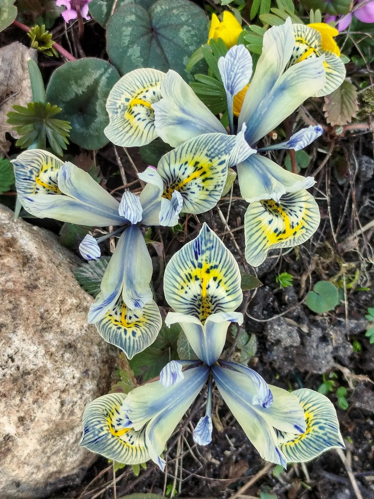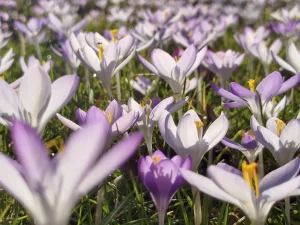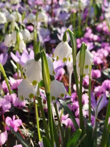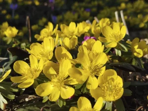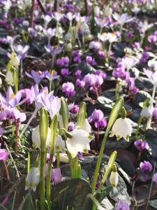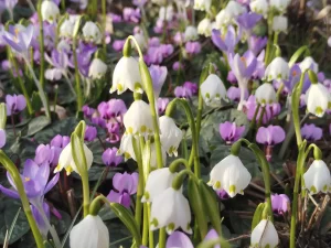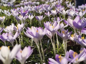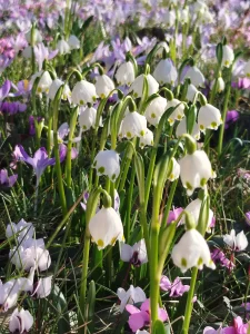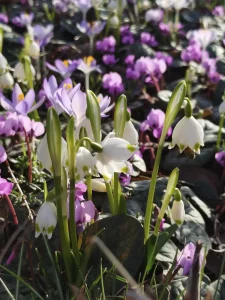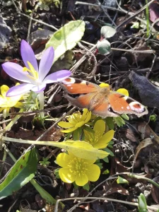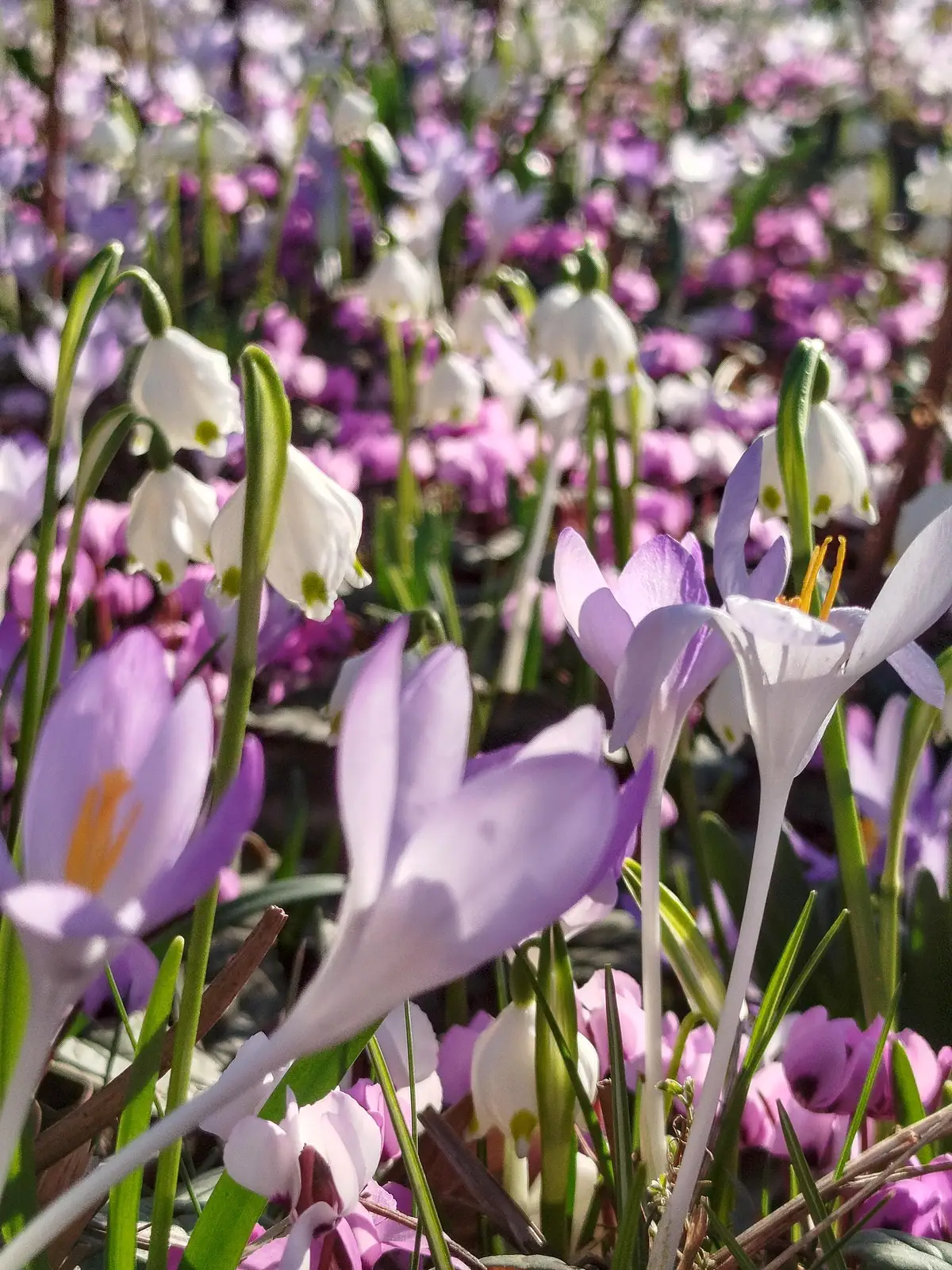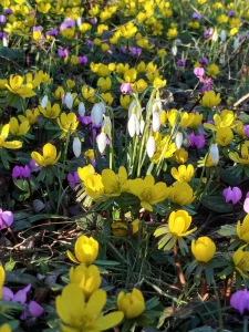 Die Winterlinge sind inzwischen fast verblüht, und auch die Elfen-Krokusse haben ihren Zenit überschritten. Dafür geht es im Blütensortiment weiter mit lila- und orangefarbenen Krokussen, Märzenbechern, Leberblümchen, Lenzrosen, Amur-Adonisröschen, Hornveilchen und vielen anderen Pflänzchen.