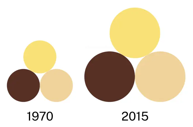 Ich habe den Größenunterschied von drei Kugeln Eis grafisch dargestellt, in der Annahme, dass eine Kugel im Jahr 1970 ein Gewicht von 28 g auf die Waage brachte und 100 g im Jahr 2015. Die Kugeln wären damit um den Faktor 3,6 schwerer geworden (und der Radius hätte sich um den Faktor 1,53 geändert). Ob es so gewesen ist, kann ich nicht beurteilen. In meiner Kindheit in den 1990er Jahren waren die Kugeln meiner Erinnerung nach ähnlich groß wie heute.