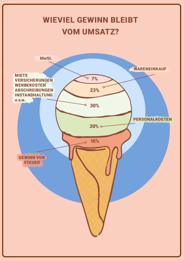 Nun kann man sich über die gestiegenen Preise ärgern und in Erinnerungen schwelgen– aber was bringt das? Auch kann man analysieren, ob der Preis für die Kugel Eis gerechtfertigt ist und die Preissteigerungen wirklich auf Kostensteigerungen basieren. Dazu hatte UNITEIS in ironischer Form in seiner Stellungnahme von 2015 hingewiesen: „Wir schätzen die Deutschen gerade wegen ihres unbestrittenen Hangs zur Analyse und ihrer Fähigkeit, mathematisch wie auch nach Aspekten der Angemessenheit zu rechnen. Es ist daher an der Zeit, dass auch das Eiscafé langsam in diese Analysen der aktuellen wirtschaftlichen Wirklichkeit aufgenommen wird.“ Aber auch da stellt sich die Frage: Was bringt das? Wenn man zum Ergebnis kommt, dass man bei der Eisdiele über den Tisch gezogen wird und Eisdielen eine Goldgrube sind, wäre es nicht schlau, dass man selbst zum Unternehmer wird und eine Eisdiele eröffnet, hm?