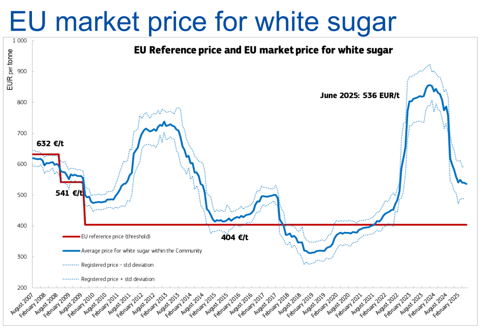 Die Kurve des Zuckerpreises sieht zwar glatter aus, schwankte auf mittel- bis langfristiger Sicht aber stärker als der Milchpreis. 2019 lag der Zuckerpreis am Boden, seitdem stieg er erst langsam und nach Kriegsbeginn rasant an. Ende 2024 fiel er wieder rapide und ist nun zum „normalen“ Niveau zurückgekehrt.