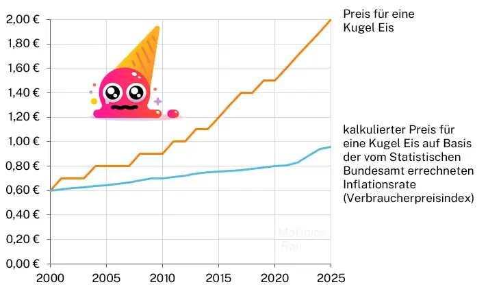 Der Eispreis hat Signalwirkung und prägt sich ein. Er ist mit dafür verantwortlich, dass die gefühlte Inflation deutlich höher ausfällt als die gemessene, allgemeine Inflation. Selbst wenn man nie Kugeleis kauft, so sieht man in der Stadt dennoch, wie viel eine Kugel Eis kostet; oder man liest es in der Zeitung oder hört die Beschwerden von Freunden. Man weiß, dass die Kugel früher viel günstiger war und denkt sich: Alles ist so viel teurer geworden!