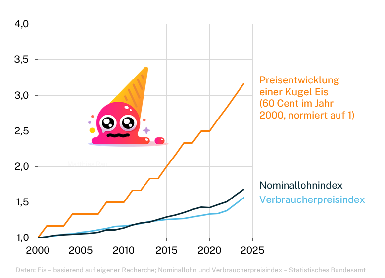 Der Mindestlohn ist von Anfang 2020 bis 2025 um 33 % gestiegen – zufällig genauso stark wie der Eispreis. Man kann davon ausgehen, dass das Aushilfspersonal in vielen Eisdielen mit dem Mindestlohn bezahlt wird oder sich die Entgeltentwicklung zumindest daran orientiert. Fachkräfte werden höher bezahlt, wie der Tarifvertrag von UNITEIS in Nordrhein-Westfalen zeigt.