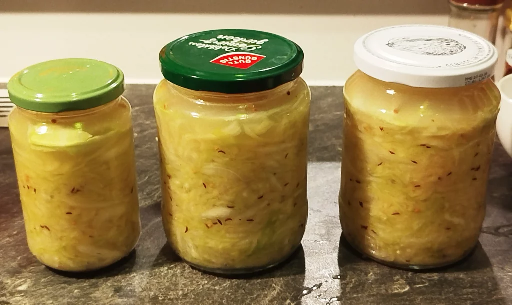 Im nahegelegenen Supermarkt werden derzeit schon wieder Erdbeeren verkauft. Weintrauben und Heidelbeeren gibt es dort das ganze Jahr über. So etwas kaufen wir nicht. Stattdessen greifen wir aktuell lieber zu Kohl, denn der hat jetzt Saison. Dieses Wintergemüse gilt als nahrhaft und wird zu niedrigen Preisen verkauft. Das Kilogramm kostet hier im Supermarkt 99 Cent. Ein Kohlkopf wiegt meist zwischen anderthalb und zwei Kilogramm. Vor einigen Tagen war ich einkaufen und habe gesehen, dass Weißkohl für 50 Cent pro Kilogramm im Angebot war. Drei Köpfe landeten im Einkaufskorb. Am Abend haben wir sie verarbeitet und Sauerkraut angesetzt.