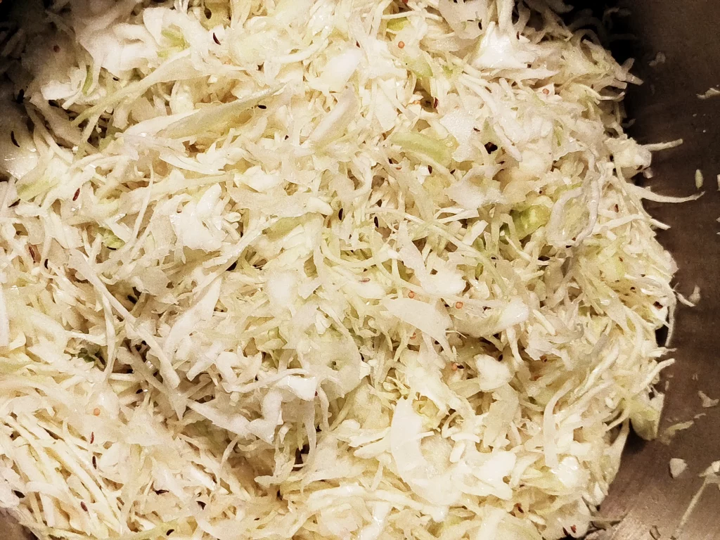 Zunächst werden die äußeren Blätter entfernt. Ein bis zwei schöne Blätter legt man im Ganzen beiseite und bewahrt sie bis zum Schluss auf. Der Kohl wird anschließend geviertelt und der Strunk entfernt. Die Viertel schneidet man dann mit dem Messer in feine Streifen oder bereitet sie so vor, dass sie in der Küchenmaschine weiterverarbeitet werden können. Pro Kilogramm geschnittenem Kohl werden etwa 20 Gramm Salz hinzugefügt. Das Salz sollte frei von Jod und Fluorid sein, da diese Zusätze die Milchsäurebakterien hemmen und den Fermentationsprozess verzögern. Hinzu kommen bei uns zwei Teelöffel Kümmel, ein Teelöffel Senfkörner und fünf zerstoßene Wacholderbeeren.